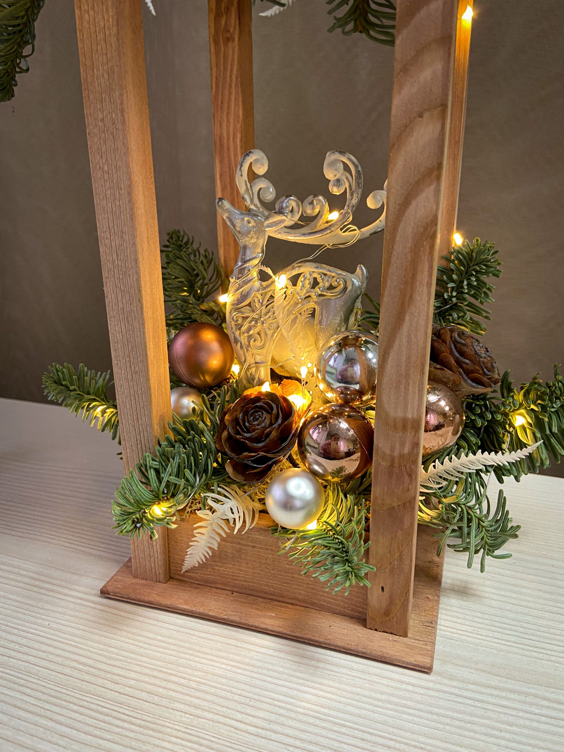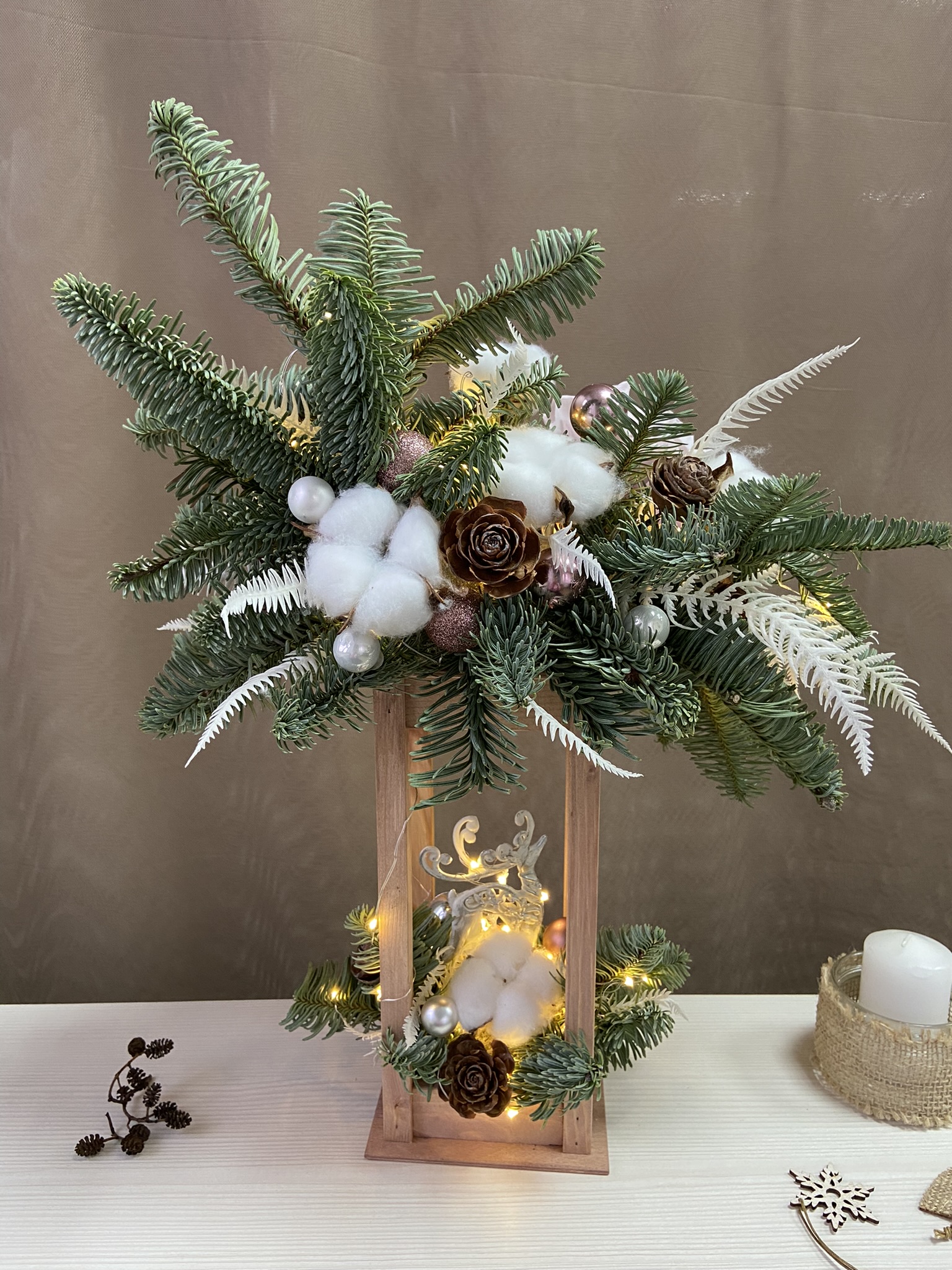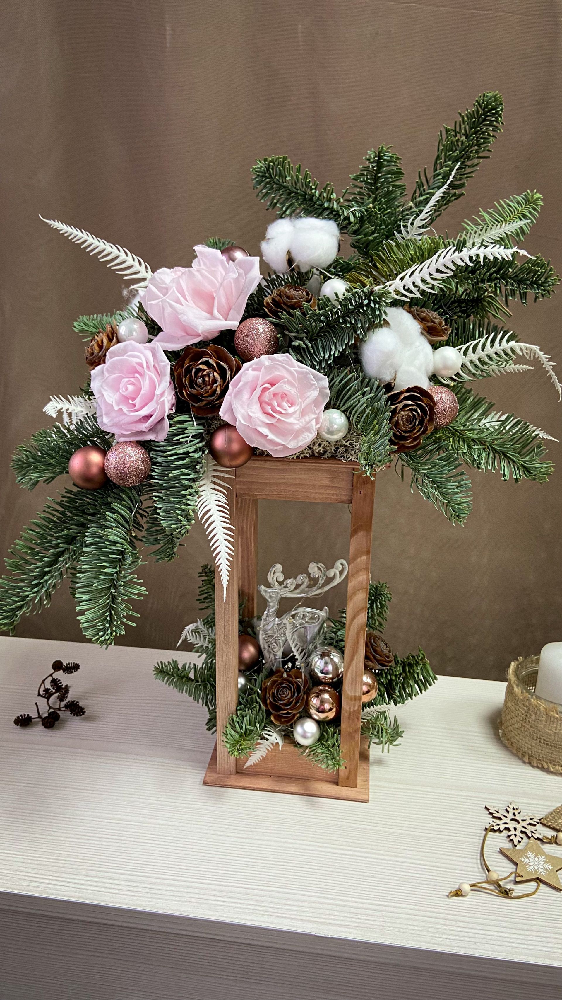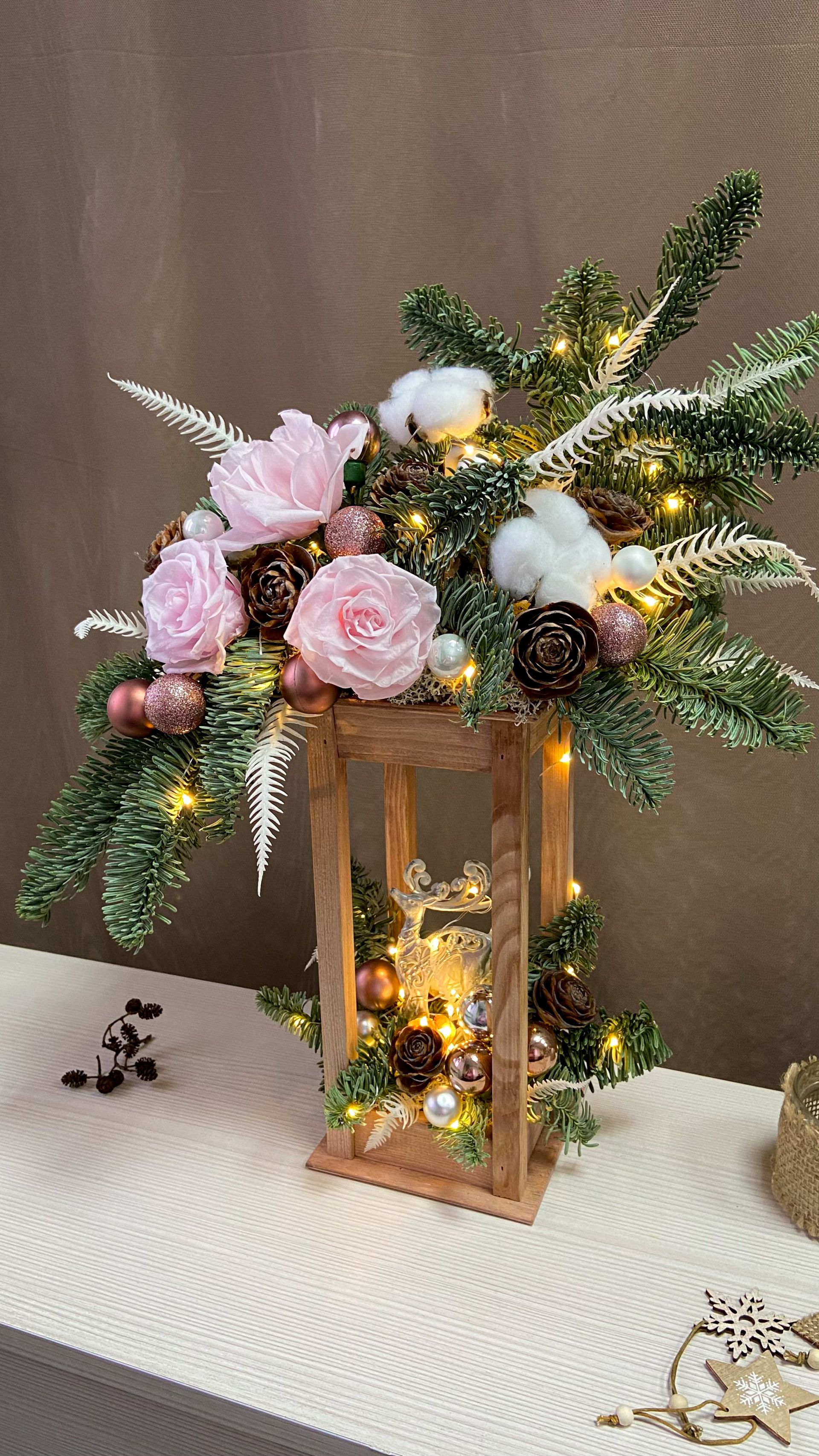 Натуральный нобилис (свежесрезанный)*. Стабилизированные растения: розы, папоротник. Сухоцветы: хлопок, шишки. Декоративные элемеенты: керамика, стекло, пластик.