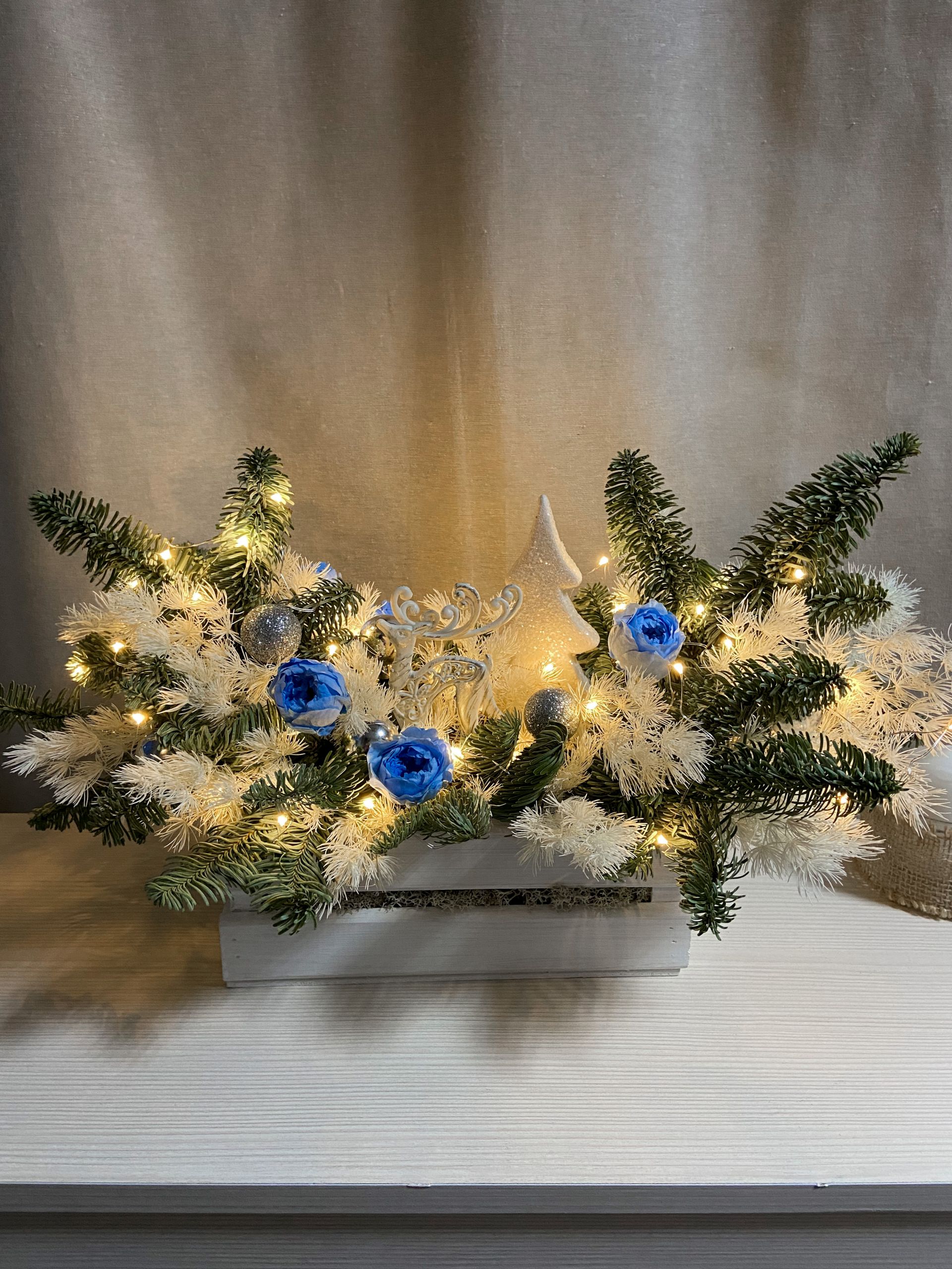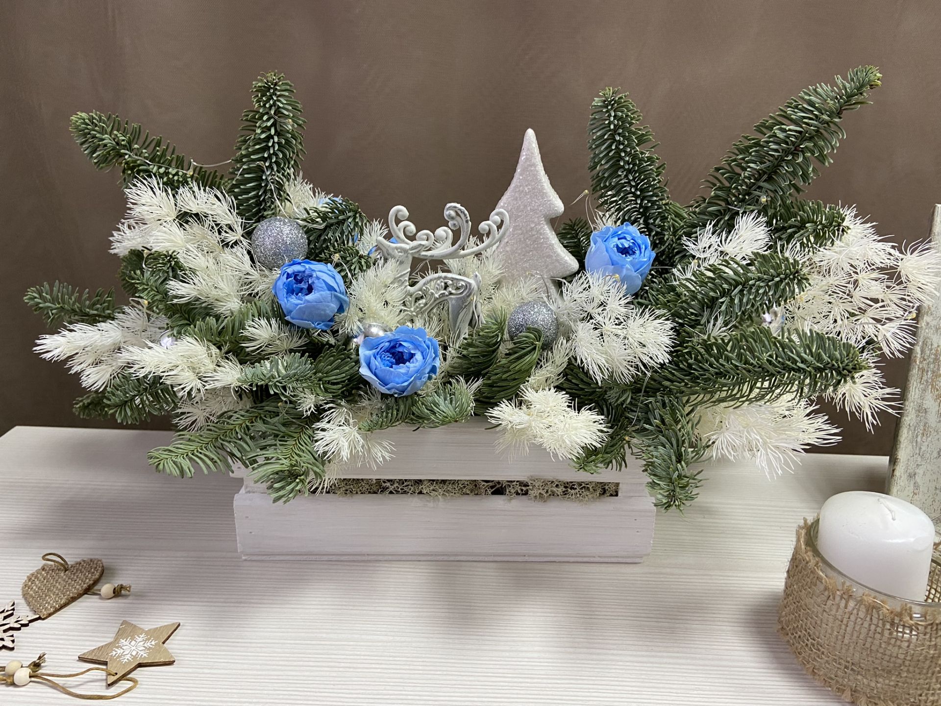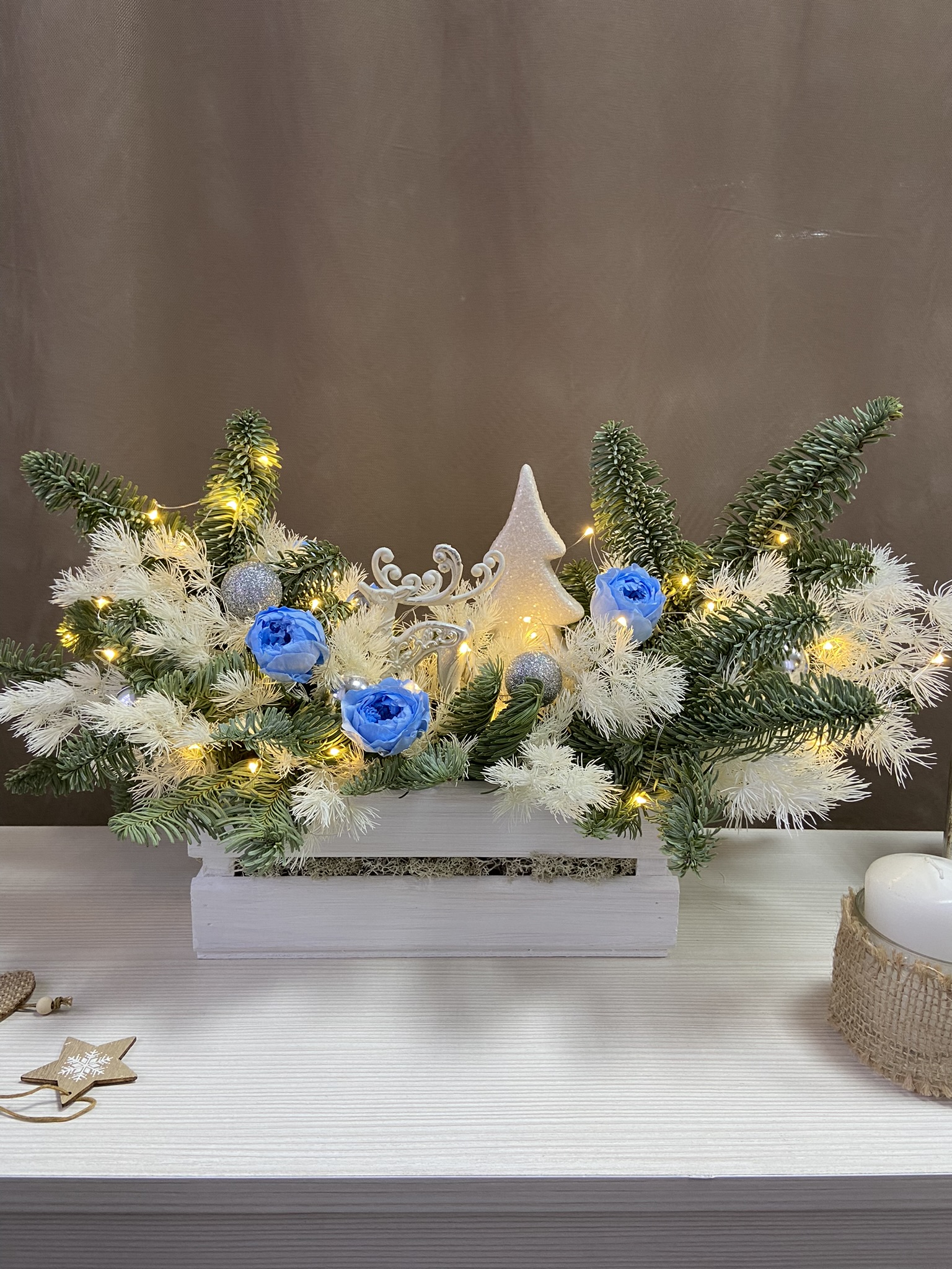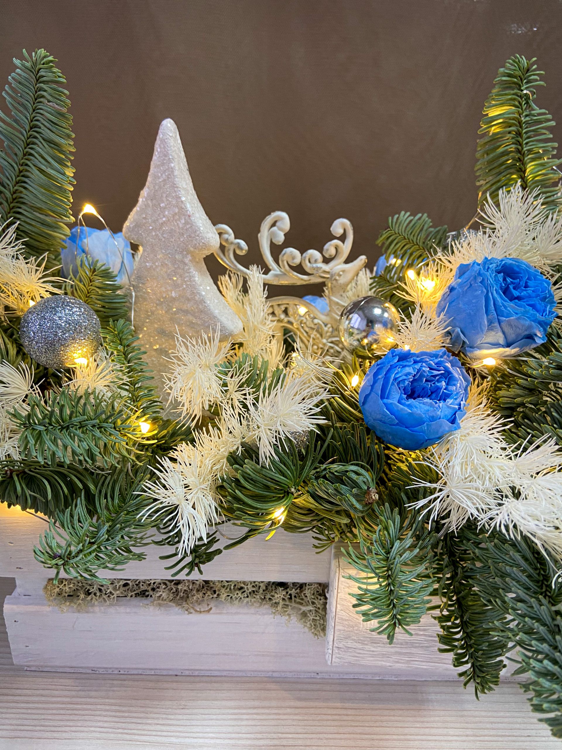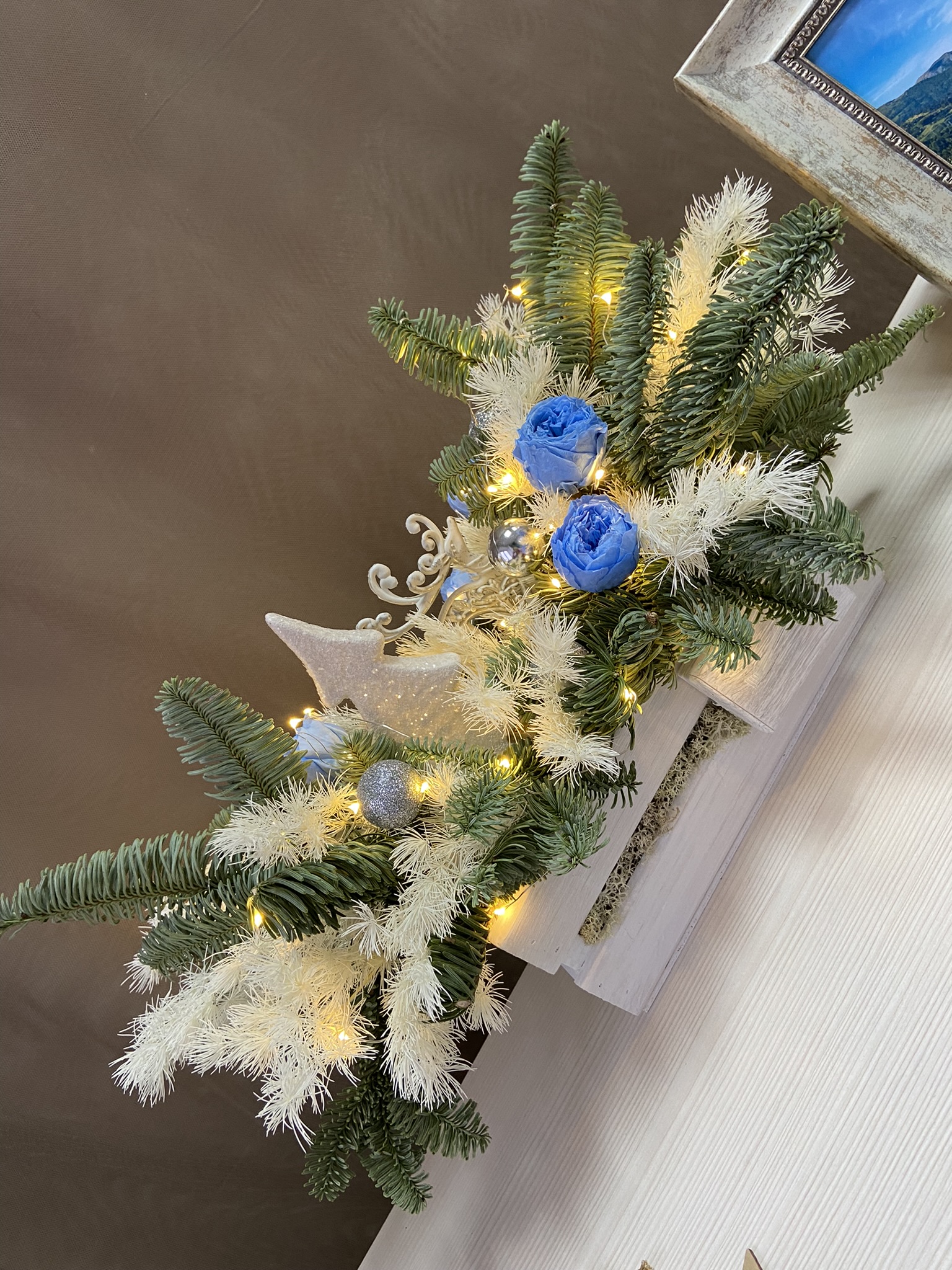 Натуральный нобилис (свежесрезанный), после высыхания эксплуатируется как сухоцвет. Стабилизированные растения: пионовидные розы (5 шт), аспарагус, мох.