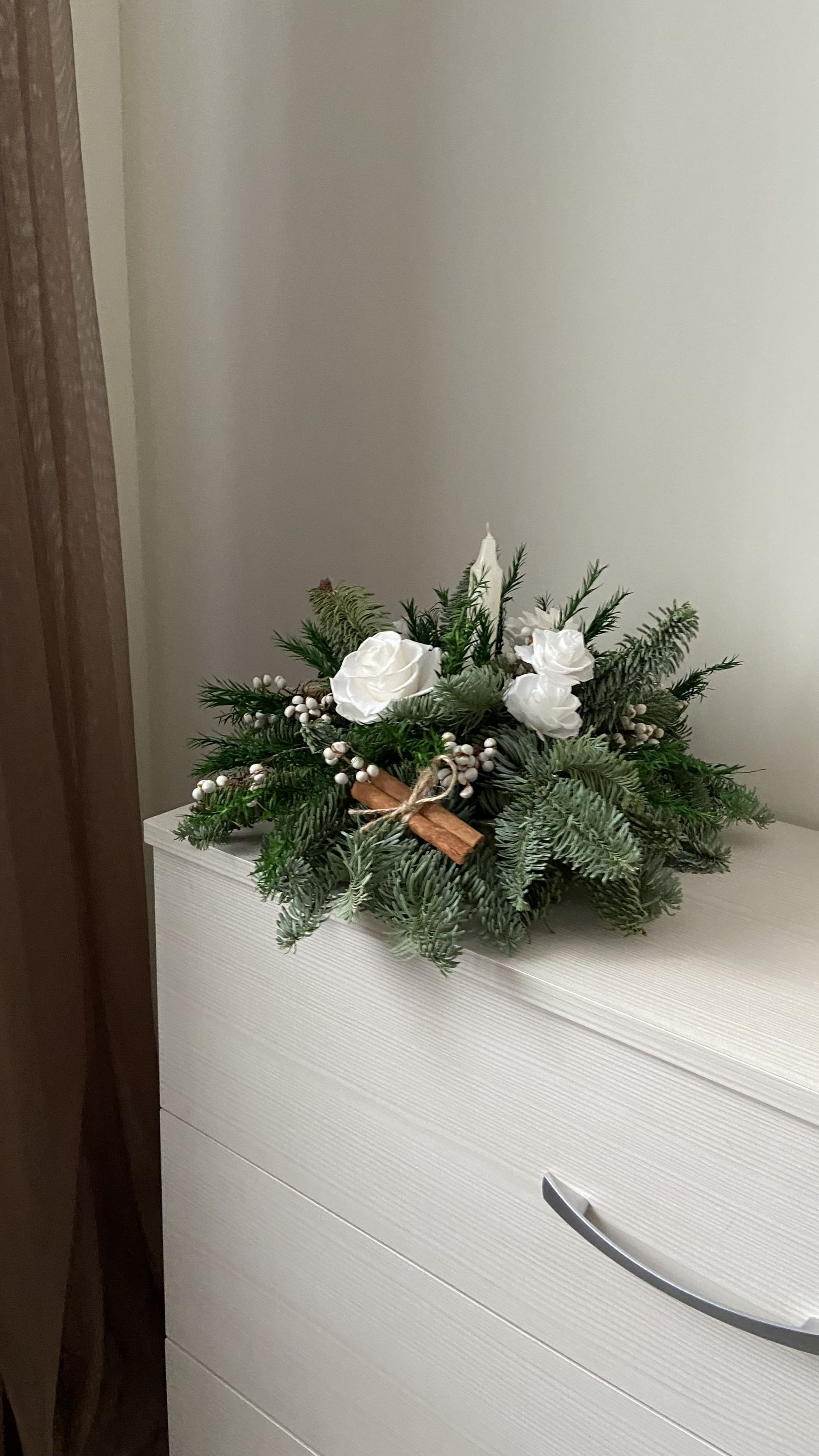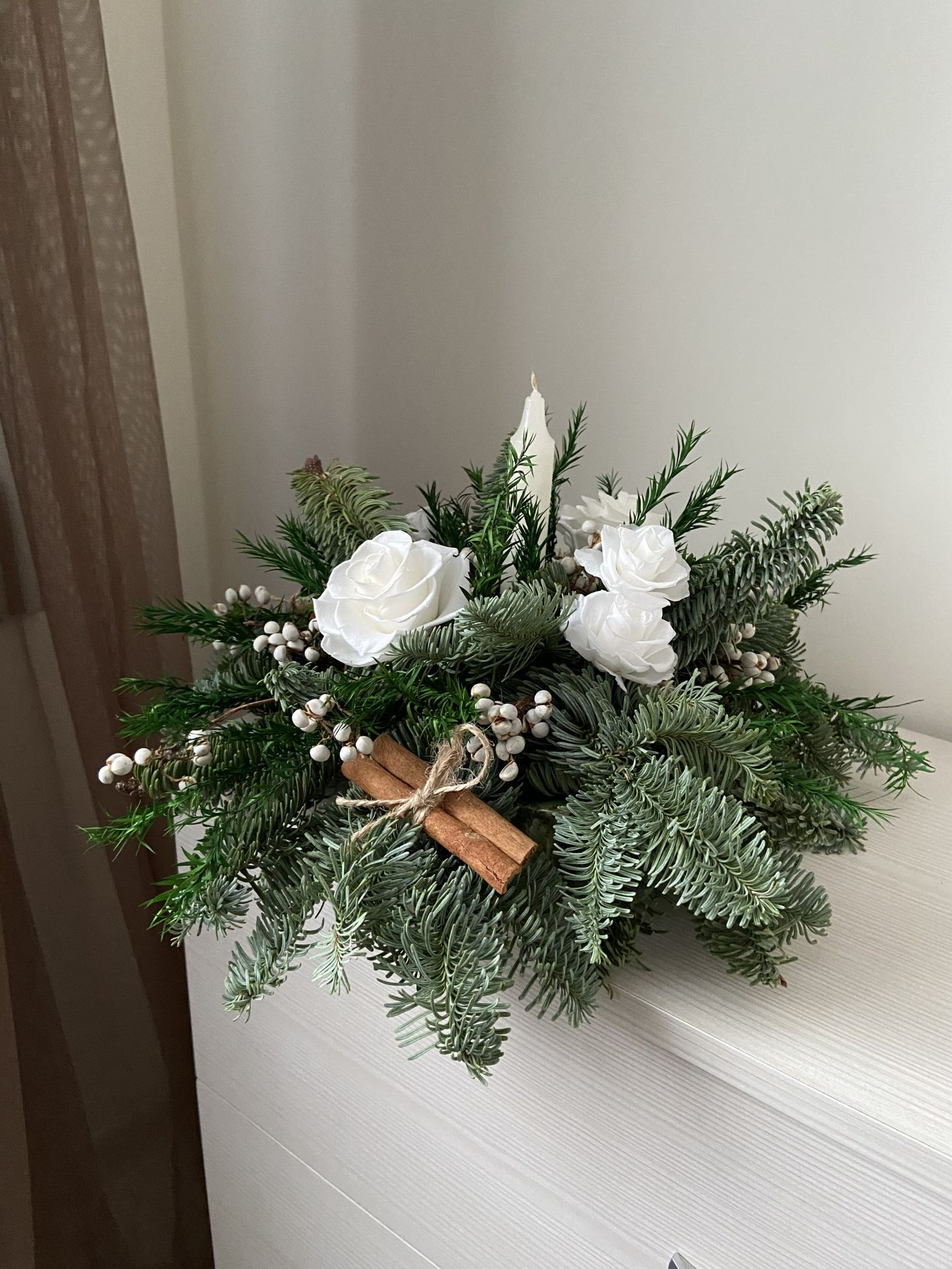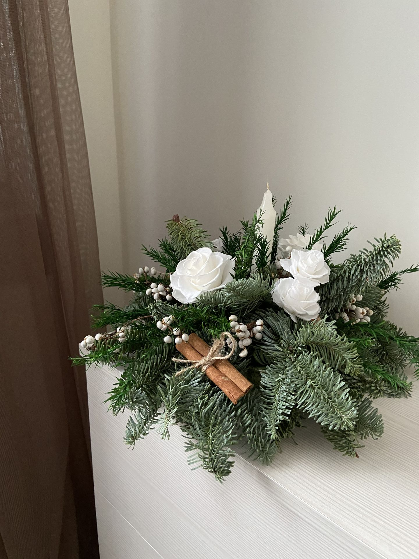 Натуральный нобилис (свежесрезанный), после высыхания - сухоцвет. Стабилизированные растения: розы, ягоды, чайное дерево. Декоративные элемеенты: палочки корицы, восковые свечи.