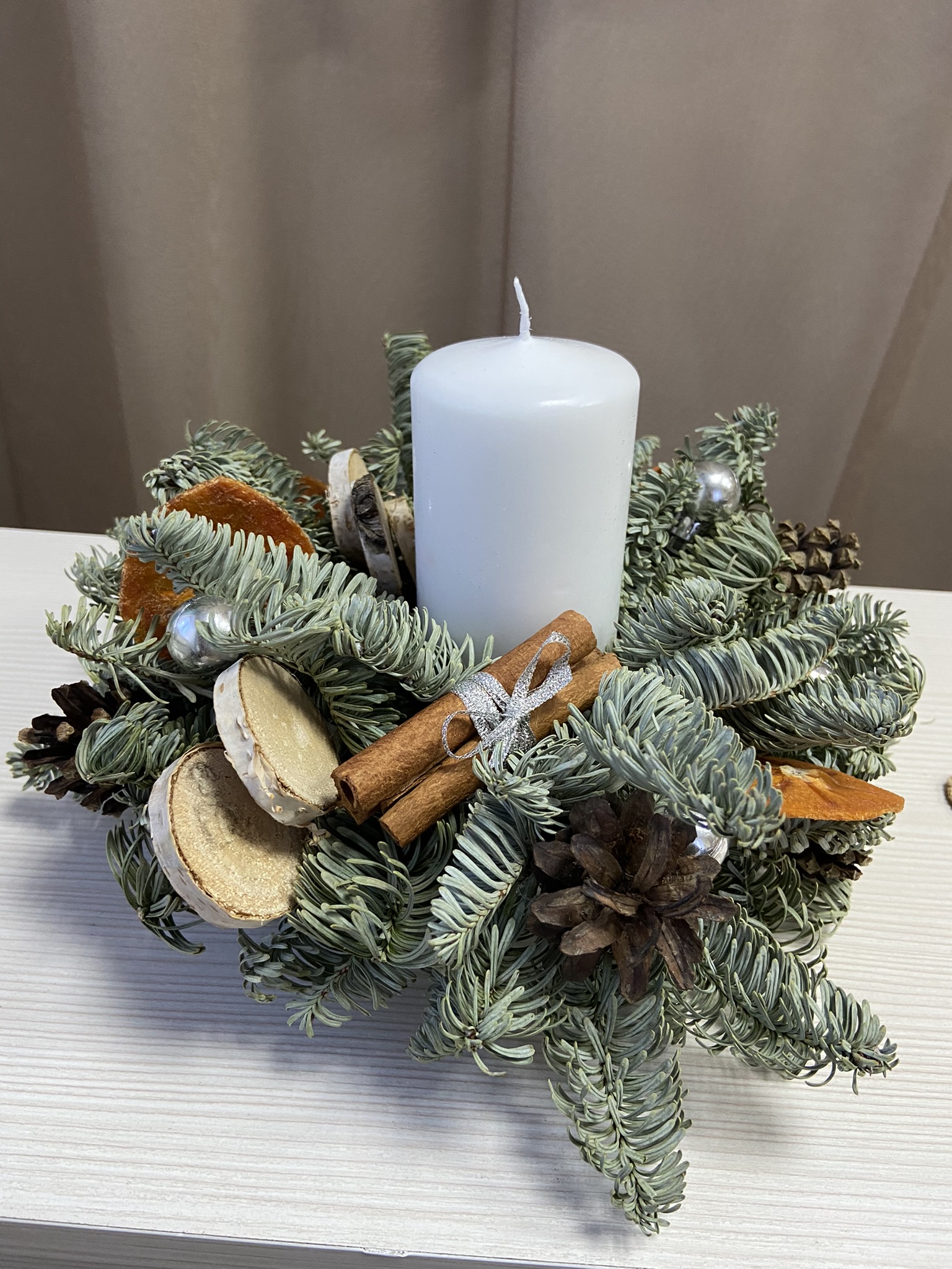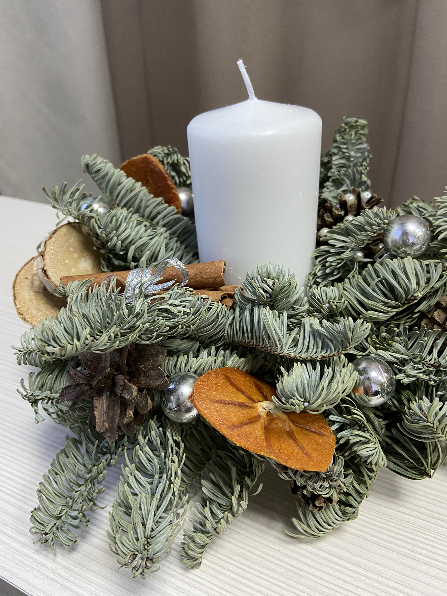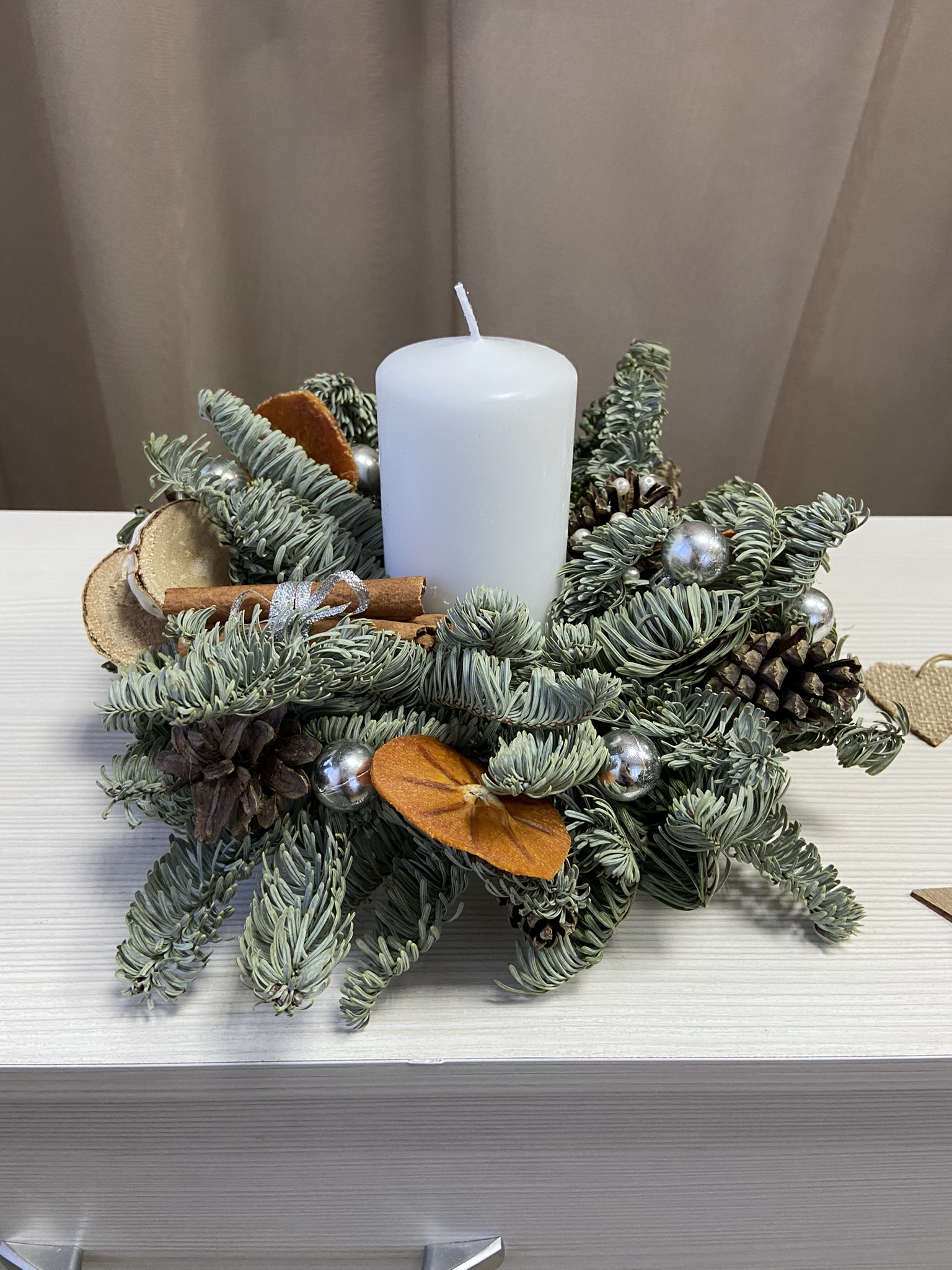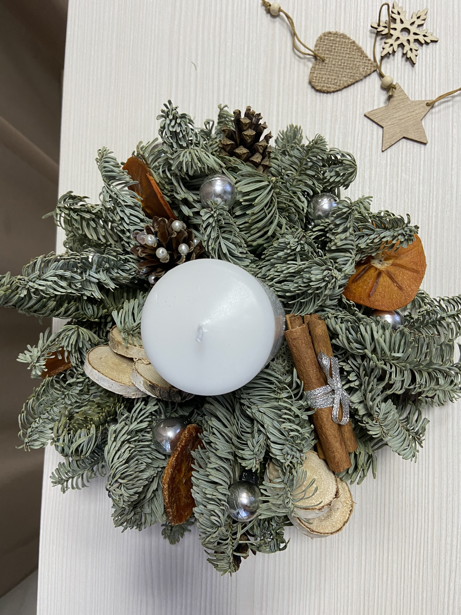 Декоративные элемеенты: шарики, свеча, палочки корицы.