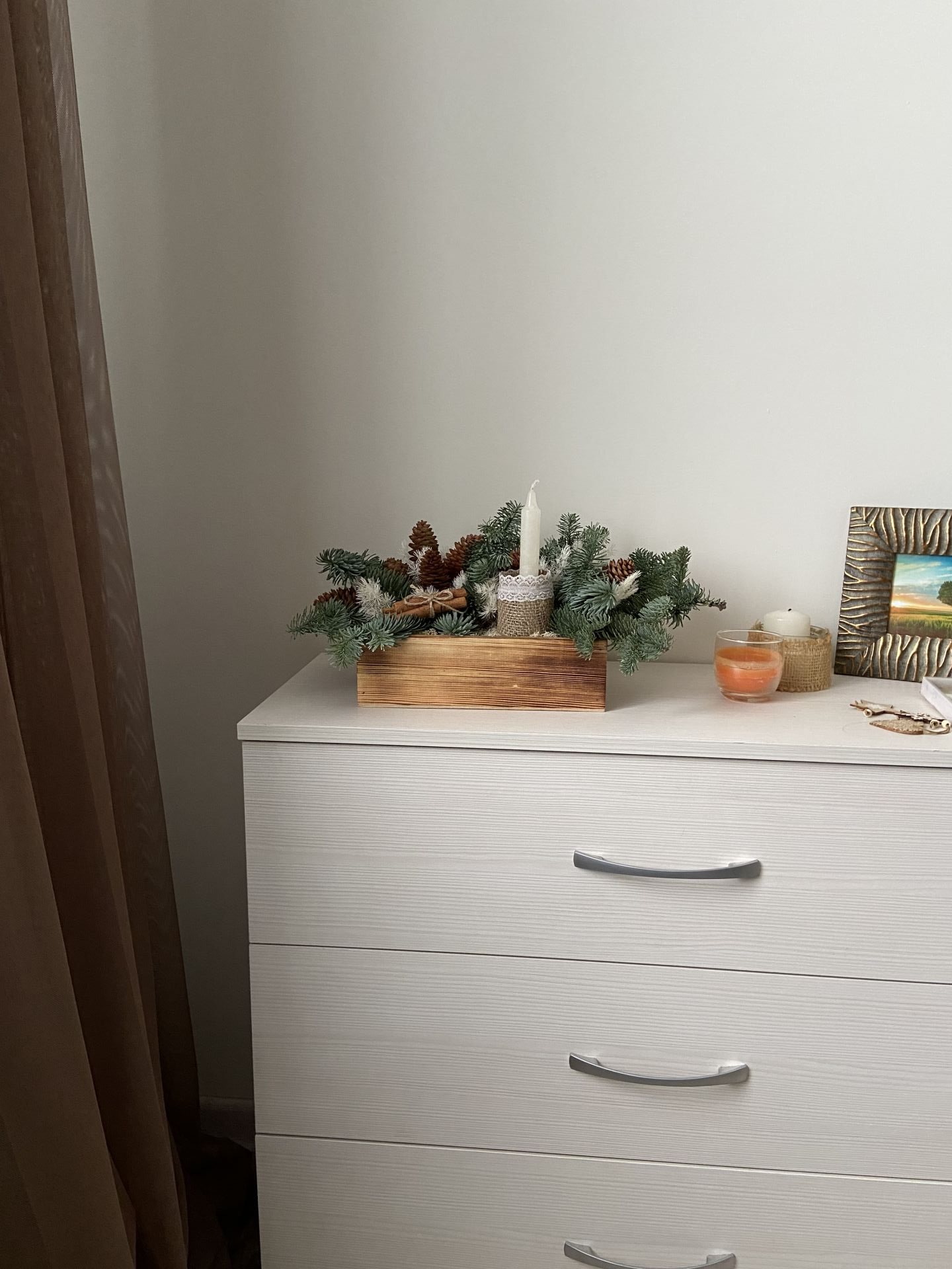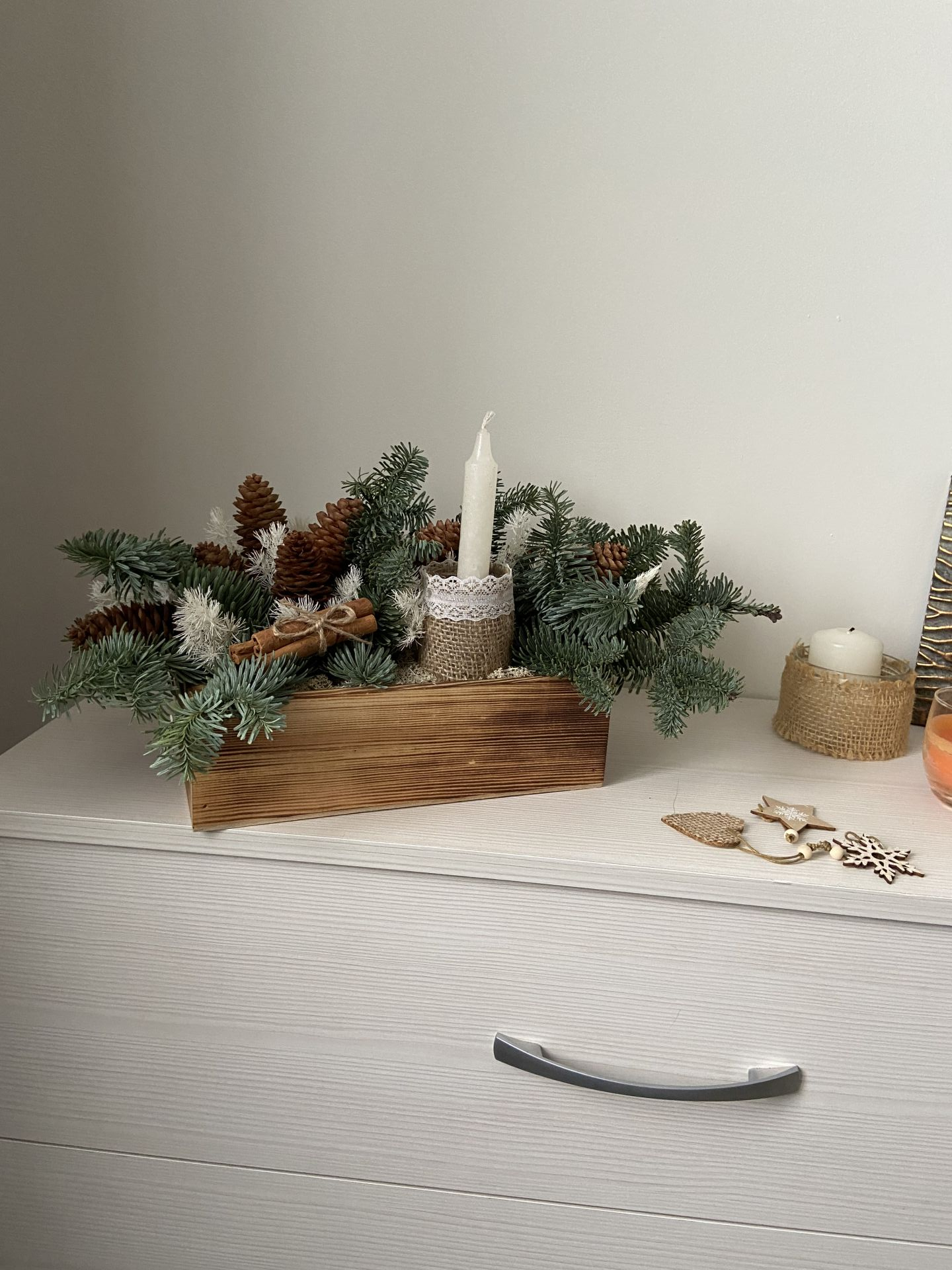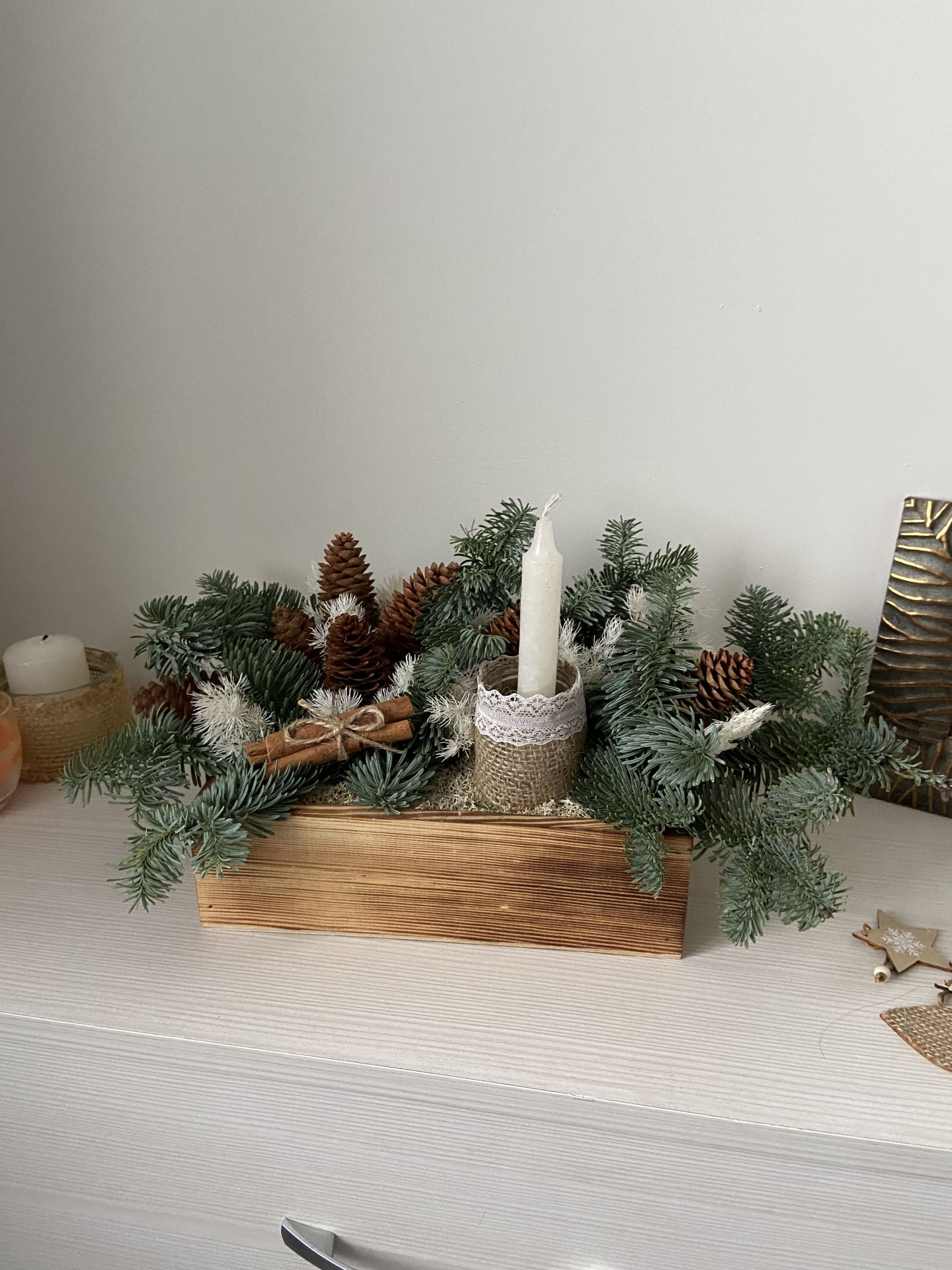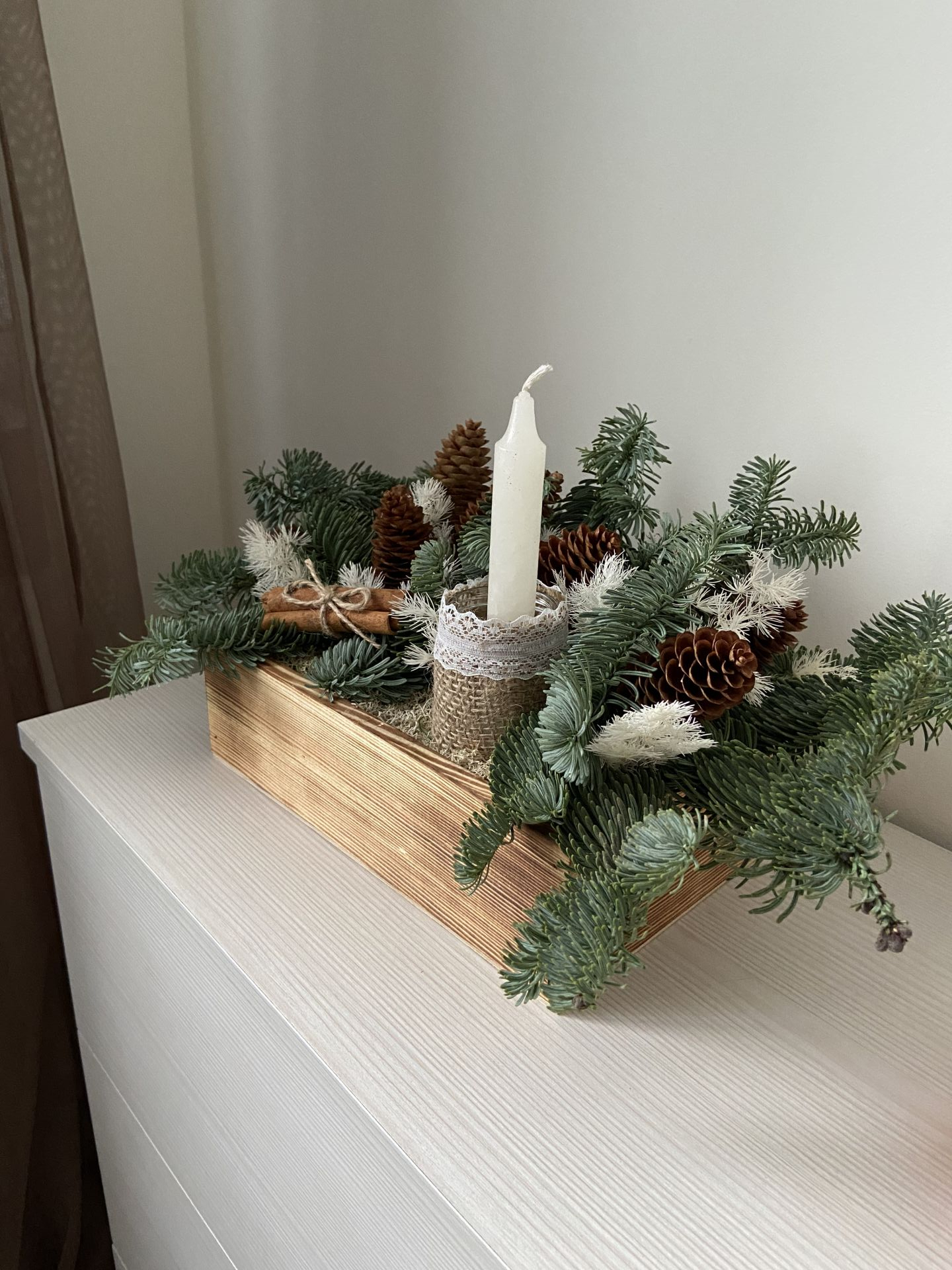 Натуральный нобилис (свежесрезанный), после высыхания - сухоцвет. Стабилизированные растения: аспарагус, мох. Декоративные элемеенты: шишки, палочки корицы, восковые свечи, стеклянный сосуд, ткань.