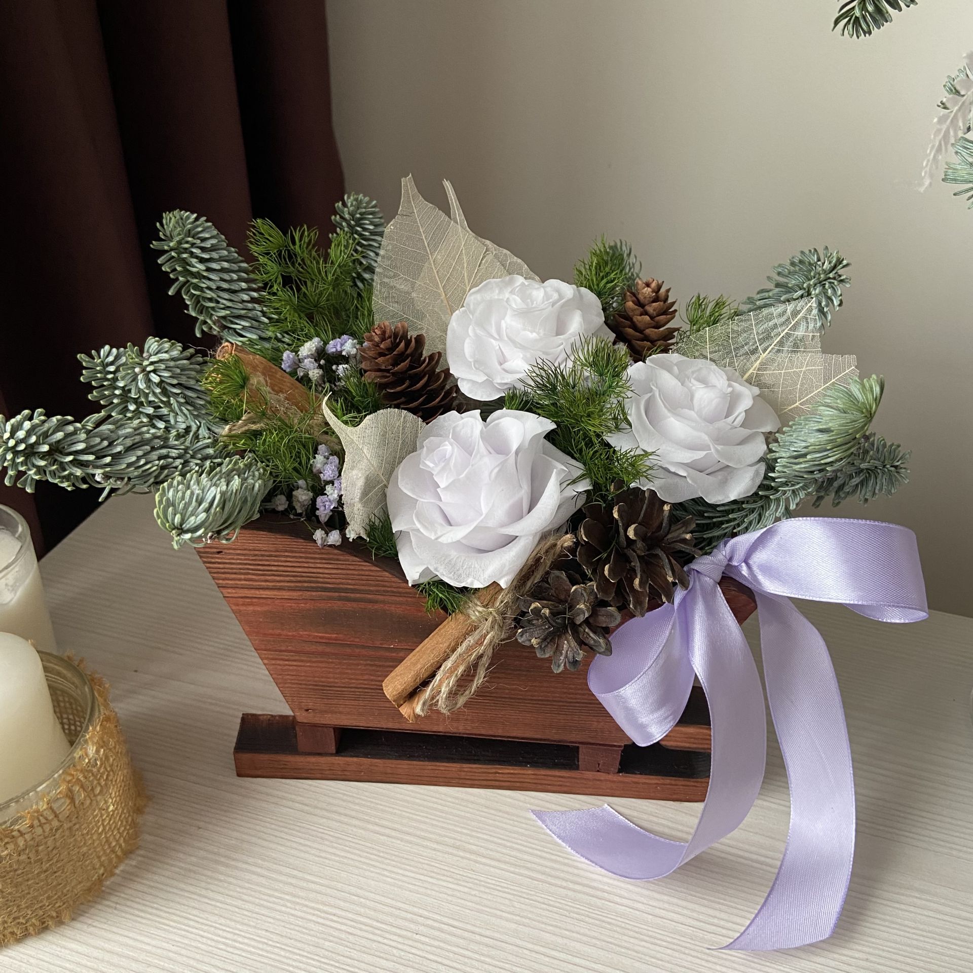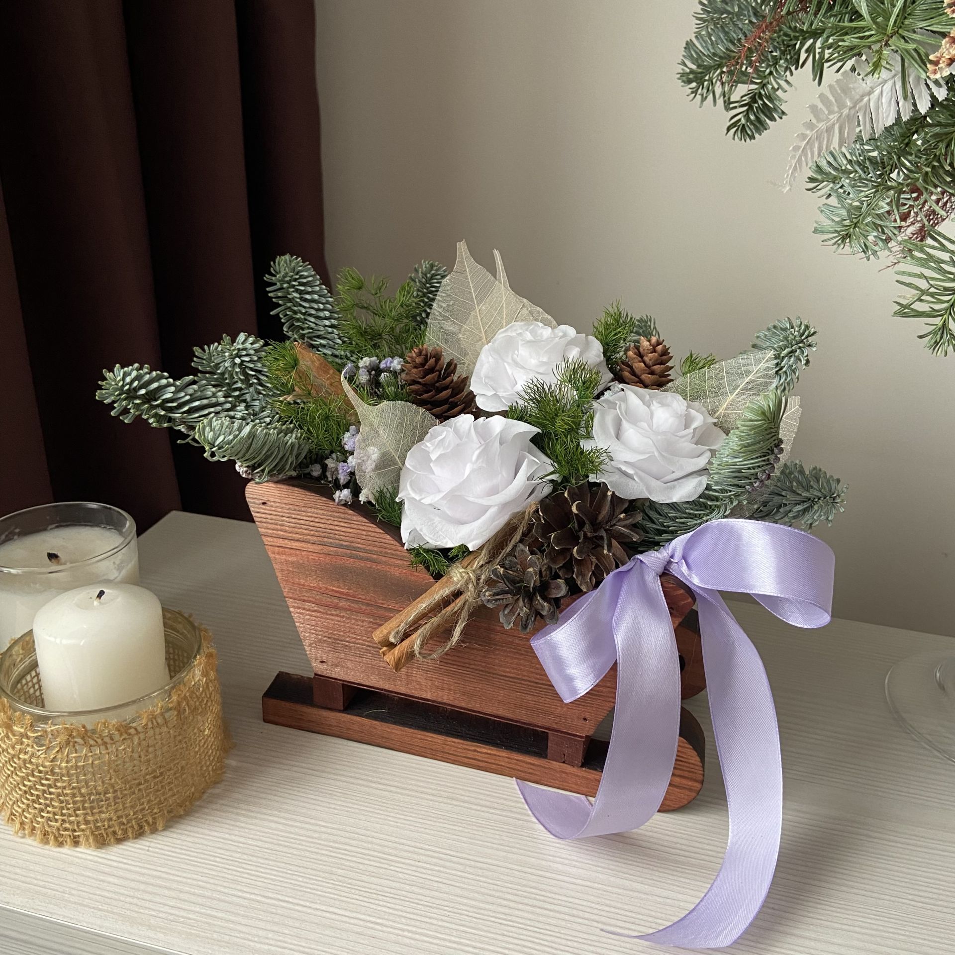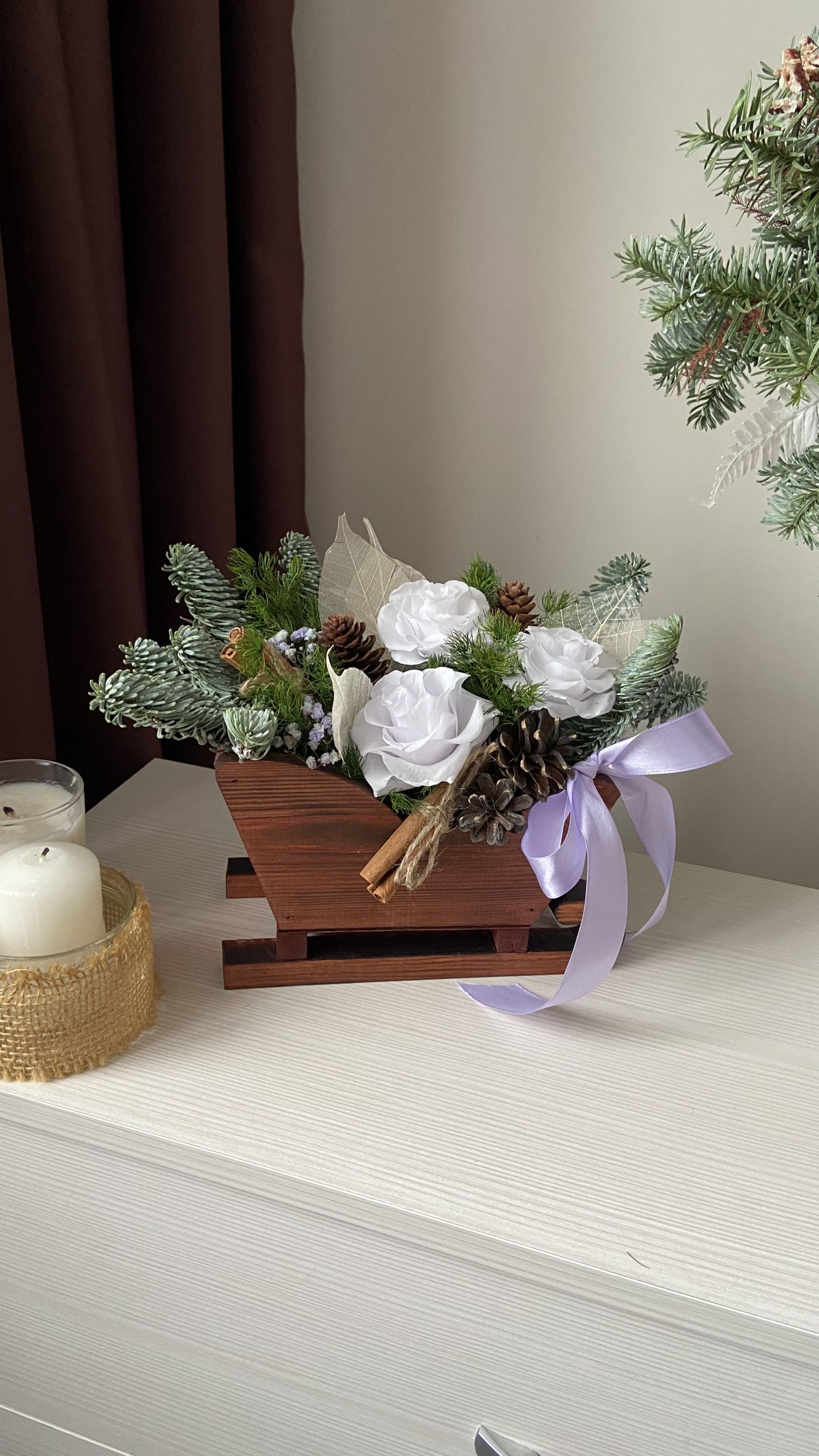 Новогодняя композиция "Рождественские сани с розами и аспарагусом"