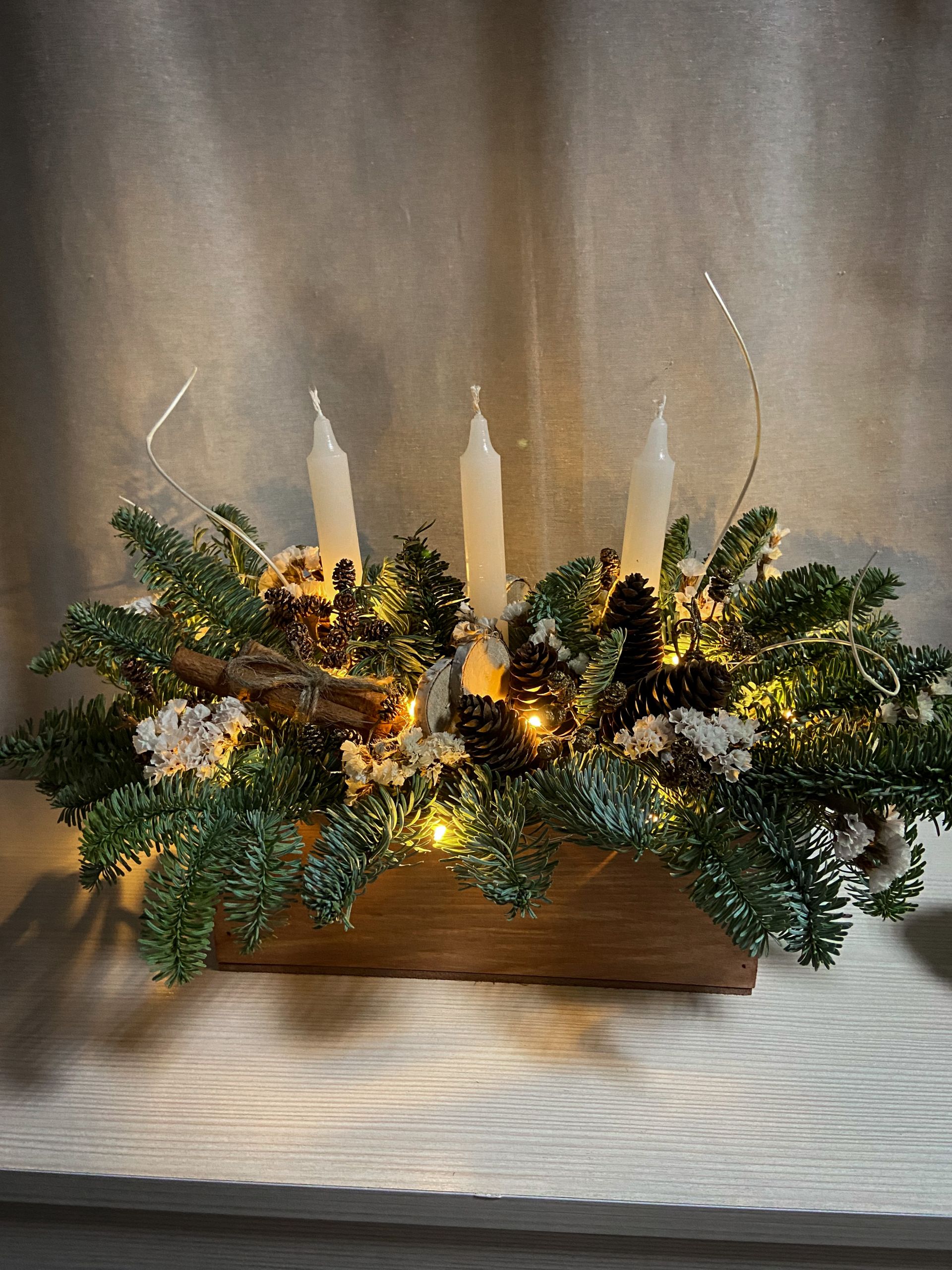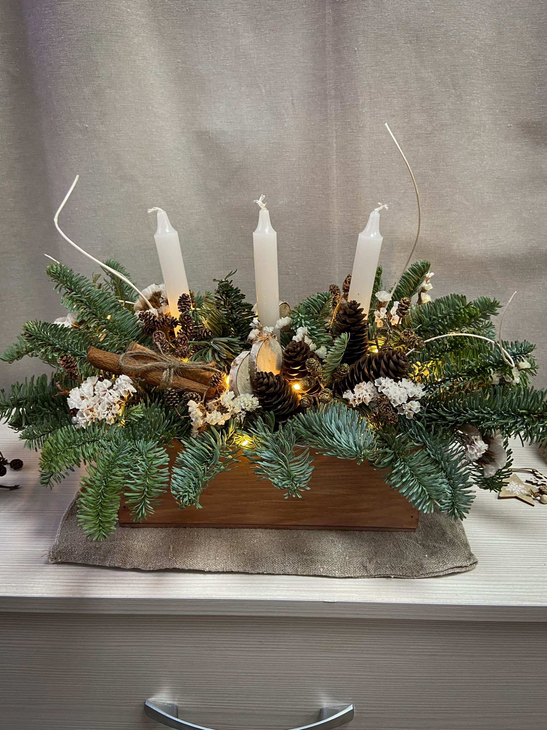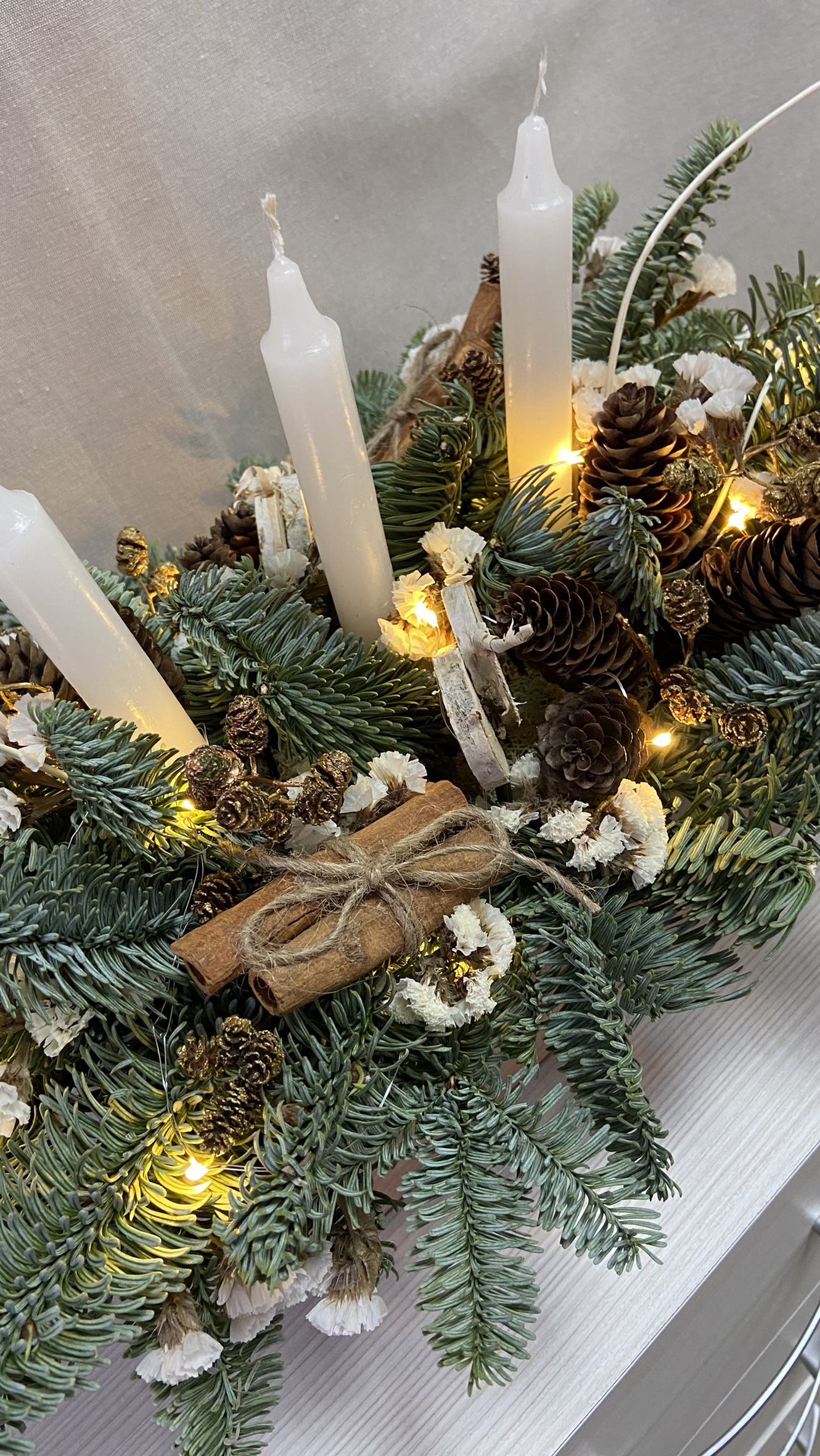 Натуральный нобилис (свежесрезанный), после высыхания эксплуатируется как сухоцвет. Стабилизированные растения: статица. Декоративные элемеенты: ольховые шишки, ёлочные шишки, палочки корицы, восковые свечи.