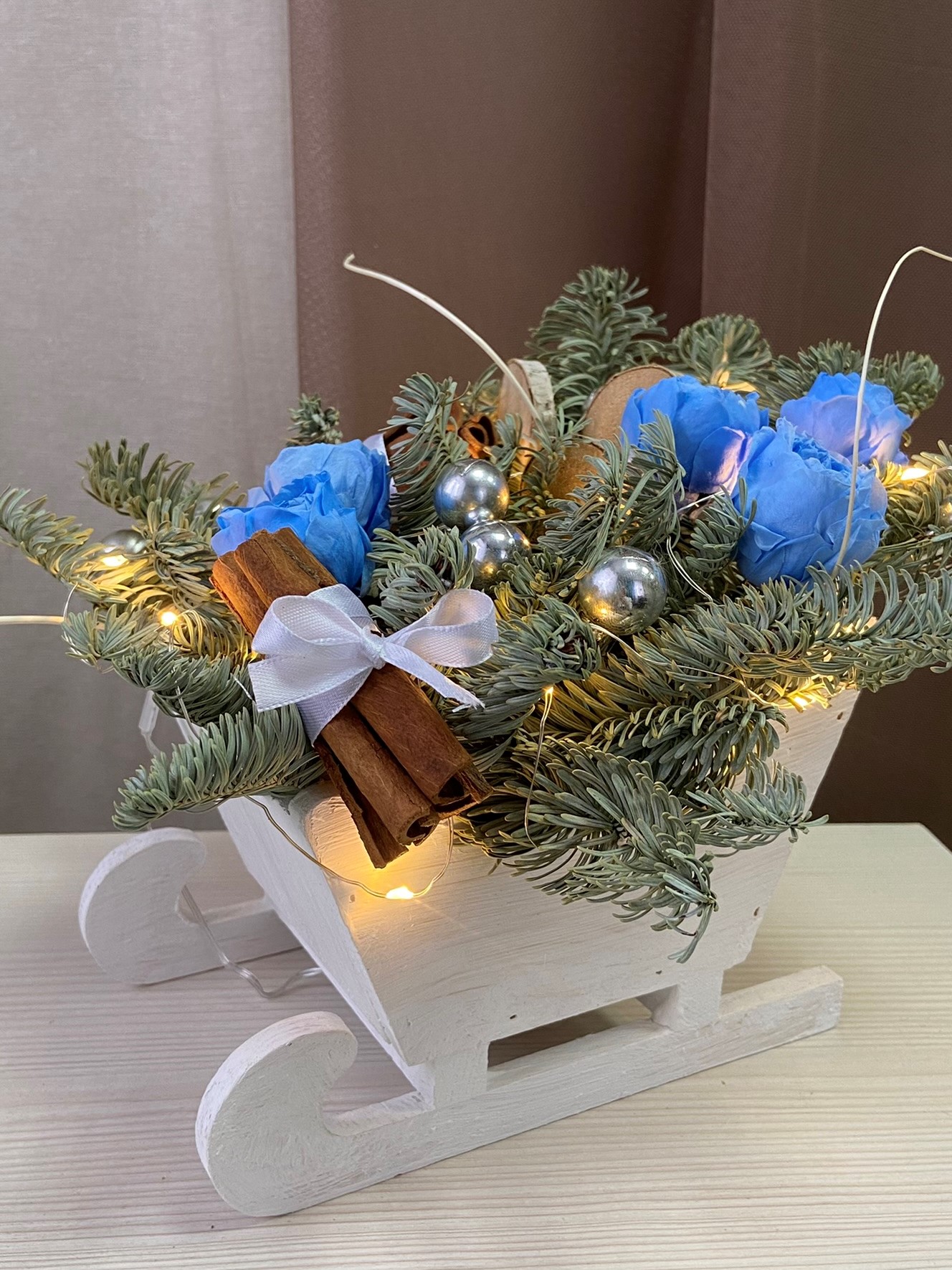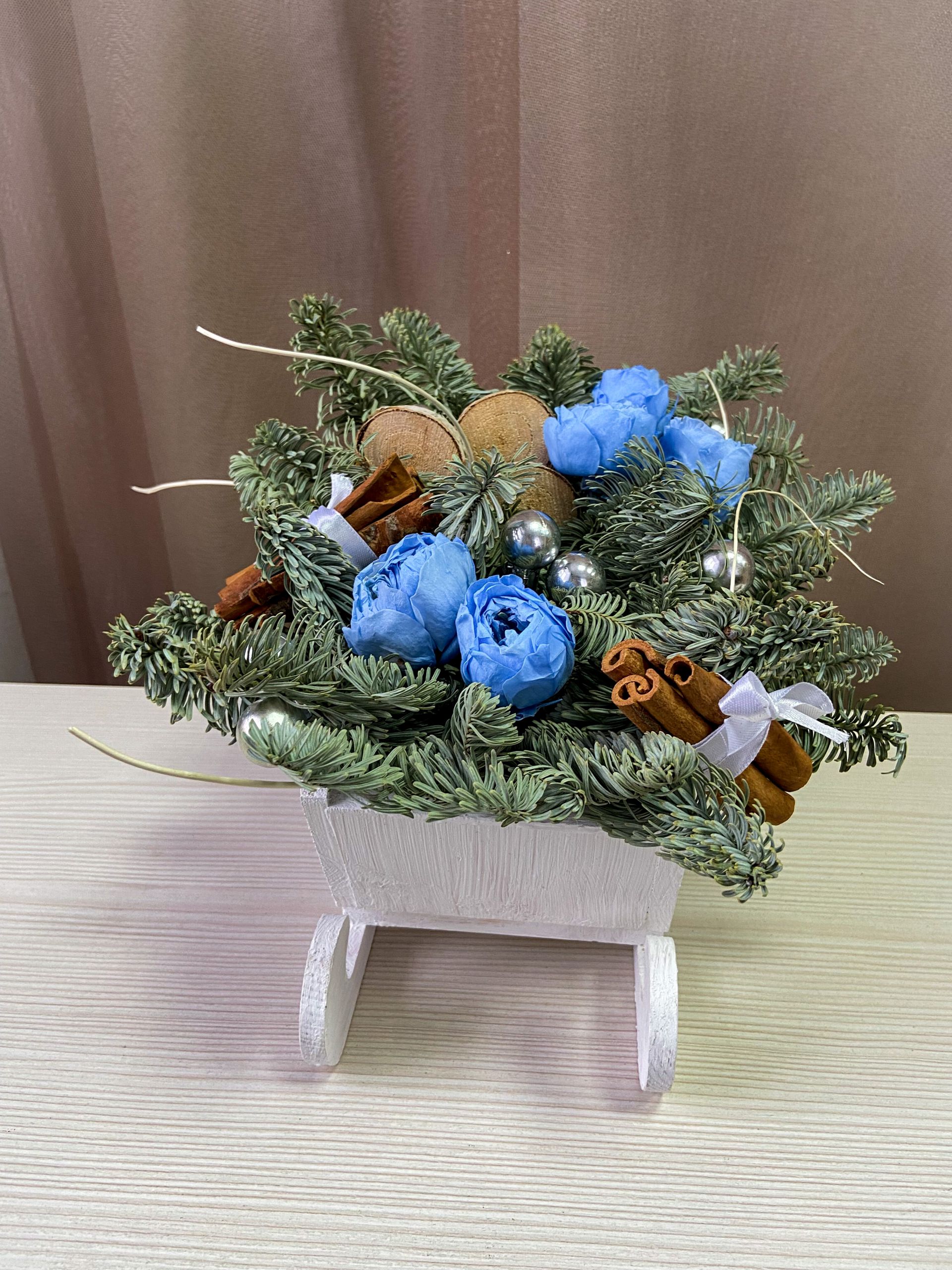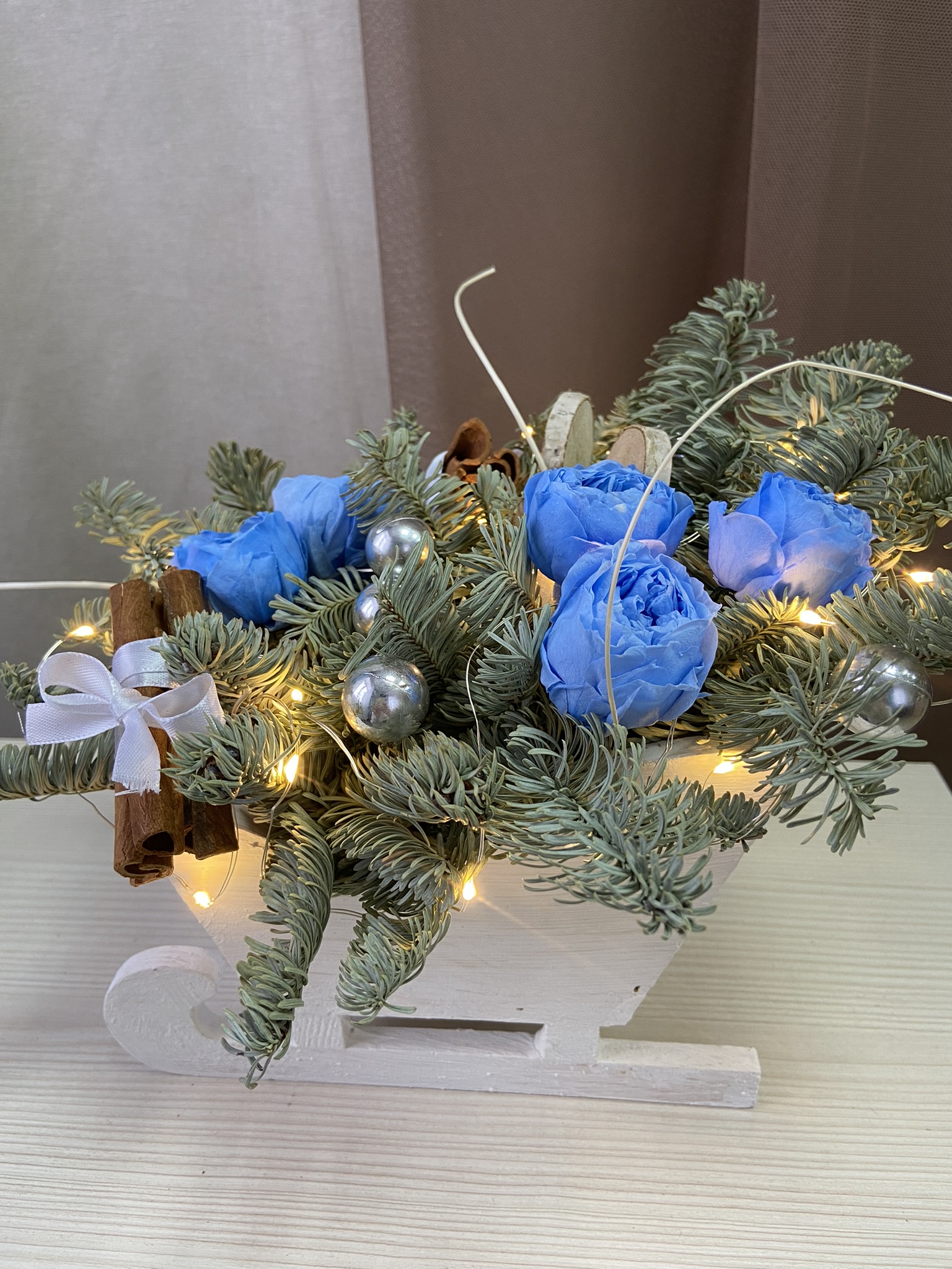 Натуральный нобилис (свежесрезанный), после высыхания - сухоцвет. Стабилизированные растения: пионовидные розы, мох.